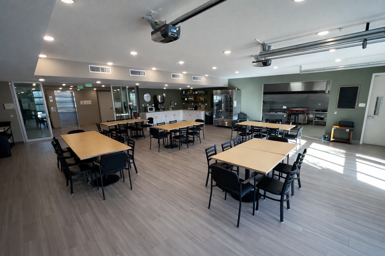 Large dining and meeting space with full commercial kitchen